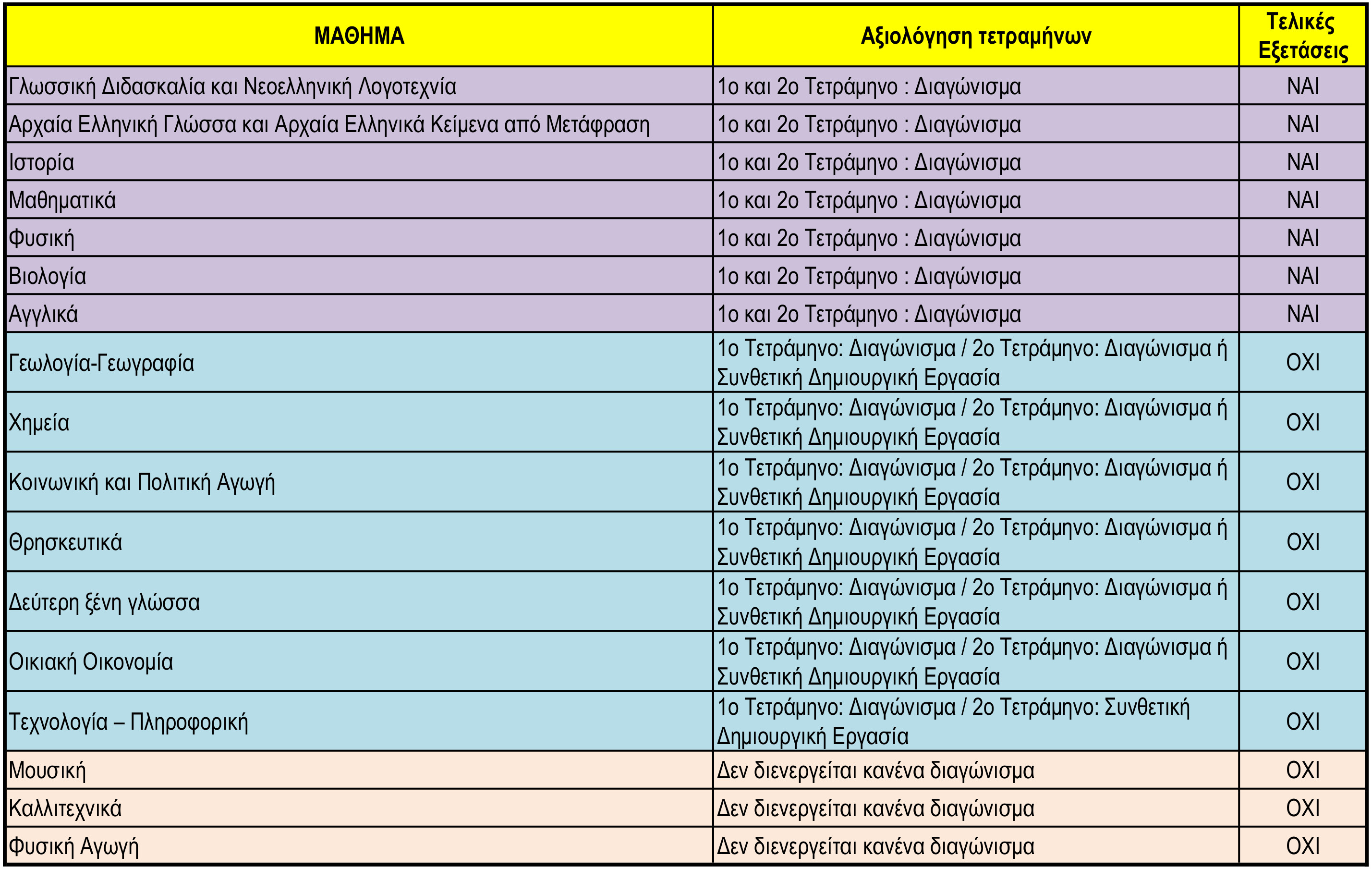 Για την αξιολόγηση της επίδοσης του μαθητή κατά τη διάρκεια των τετραμήνων συνεκτιμώνται τα παρακάτω κριτήρια: