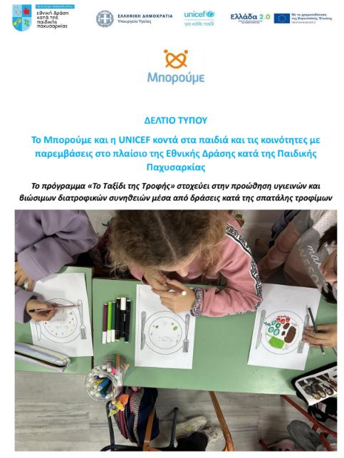 "Το Ταξίδι της Τροφής" εντάσσεται στο πλαίσιο του «Εθνικού Προγράμματος Άσκησης και Υγιεινής Διατροφής - Αντιμετώπιση της παιδικής παχυσαρκίας» του Υπουργείου Υγείας, το οποίο υλοποιείται σε συνεργασία με τη UNICEF με χρηματοδότηση από το Ταμείο Ανάκαμψης και Ανθεκτικότητας Ελλάδα 2.0. Το Μπορούμε, συμμετέχει ως εταίρος υλοποίησης παρεμβάσεων στα σχολεία και τις τοπικές κοινότητες για τη μείωση της σπατάλης τροφίμων και την προώθηση υγιεινών και βιώσιμων διατροφικών συνηθειών».